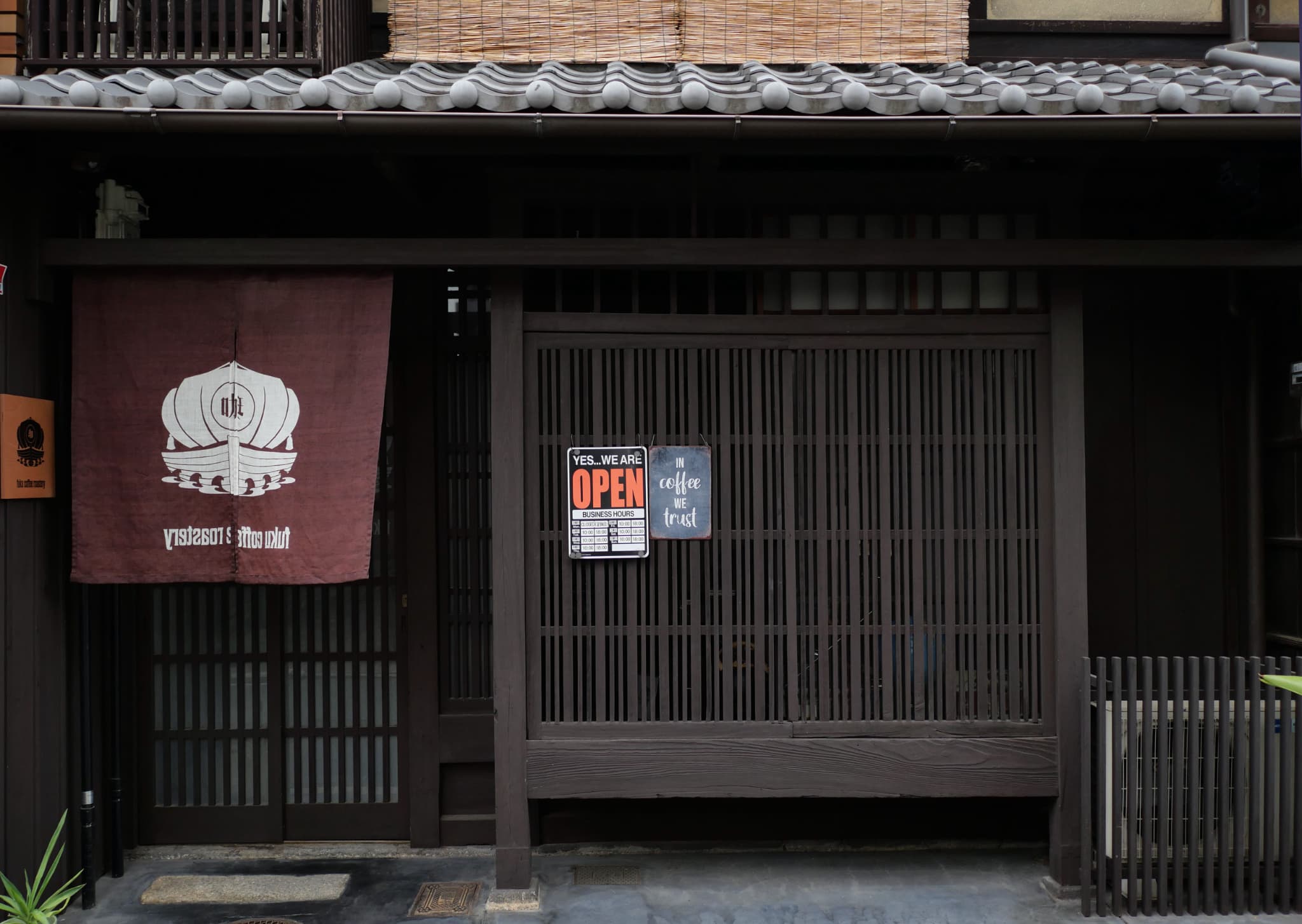 fuku coffee roasteryは、清水寺や六波羅密寺がある京都東山にあるコーヒー焙煎店です。店舗は、店主が幼少期に祖母と暮らしていた明治中期に建築された古い町家(あじき路地母屋)を利用しています。